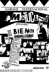 Imagen: afiche «III Bienal Garage Internacional Matucana», Santiago de Chile (junio, 1987), diseño de Rosa Lloret.